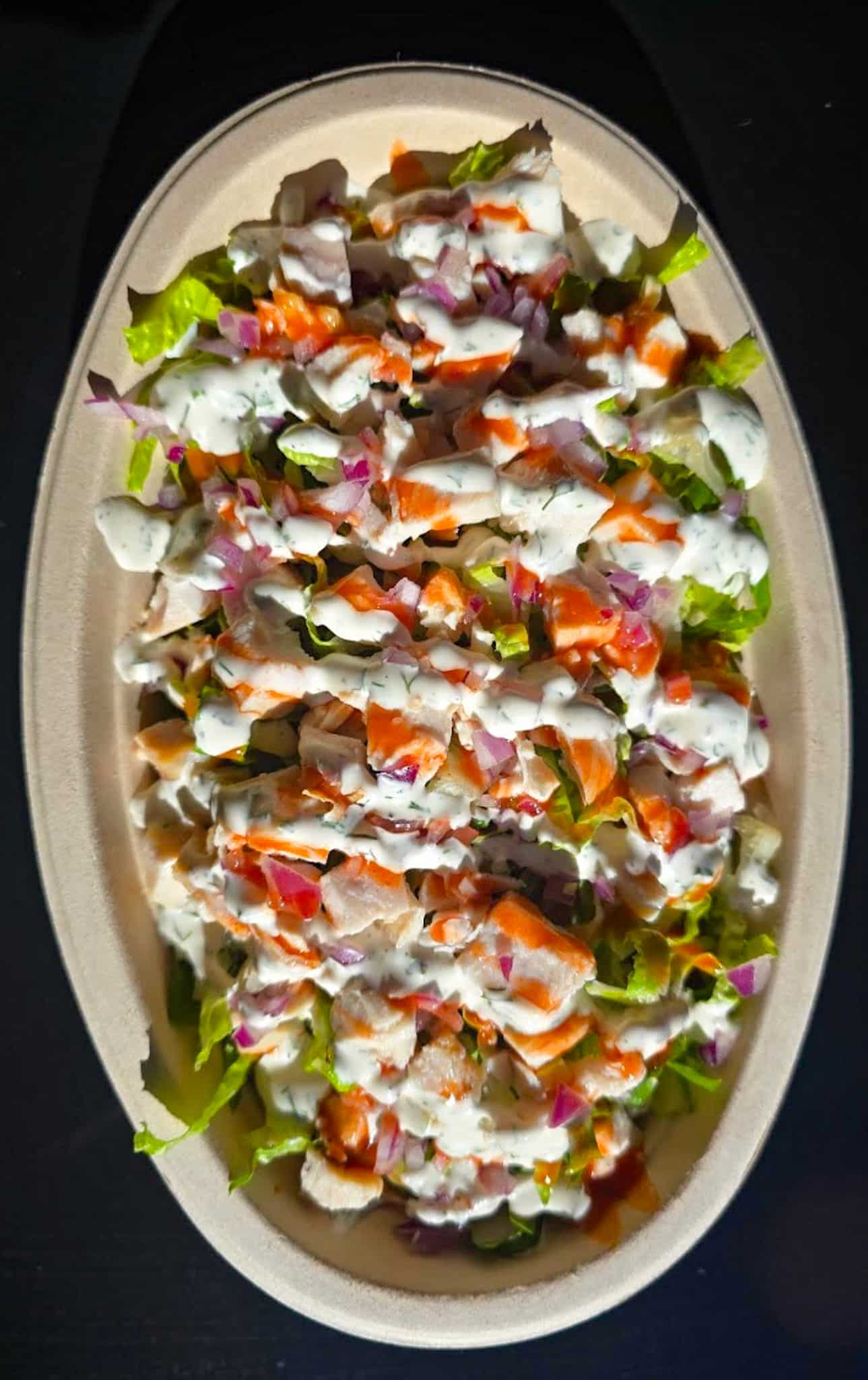 Egg White, Lettuce, Grilled Chicken, Red Onion, Buffalo Sauce, and House Made Creamy Ranch.